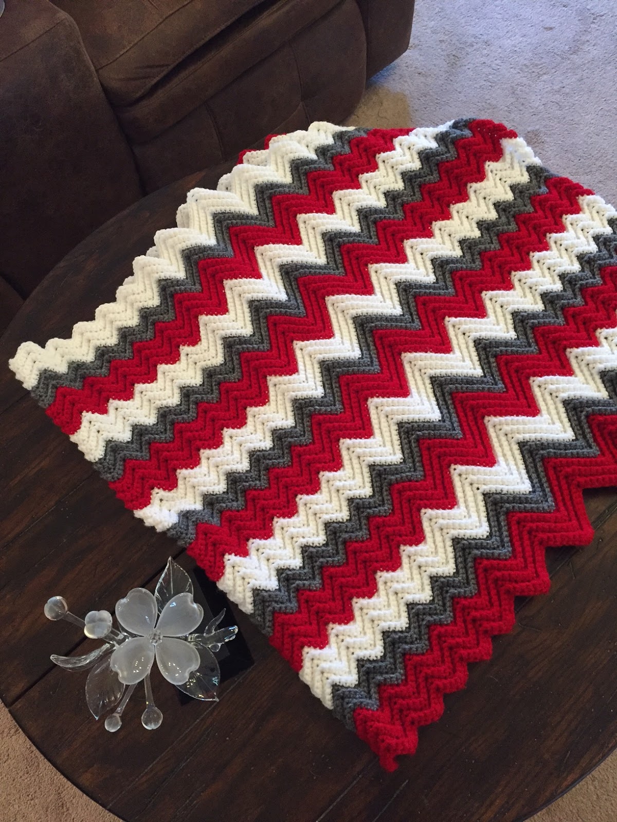In 2014, Elijah (the eldest, the dark-hared boy in the back row) received this red and black afghan: